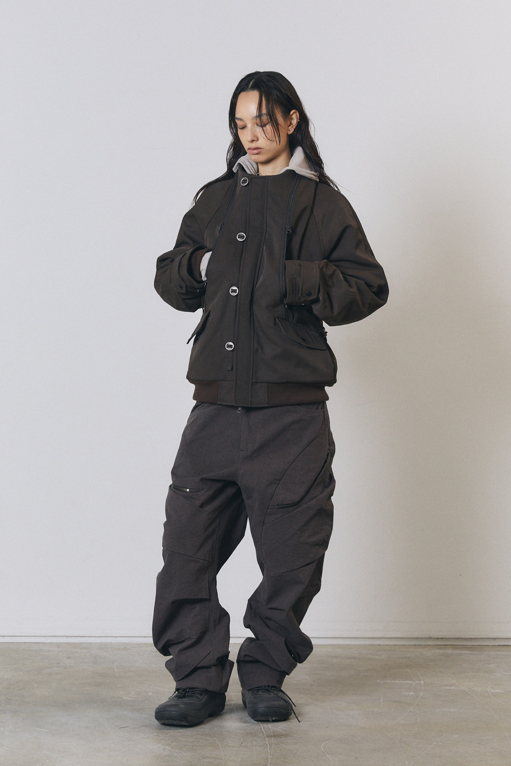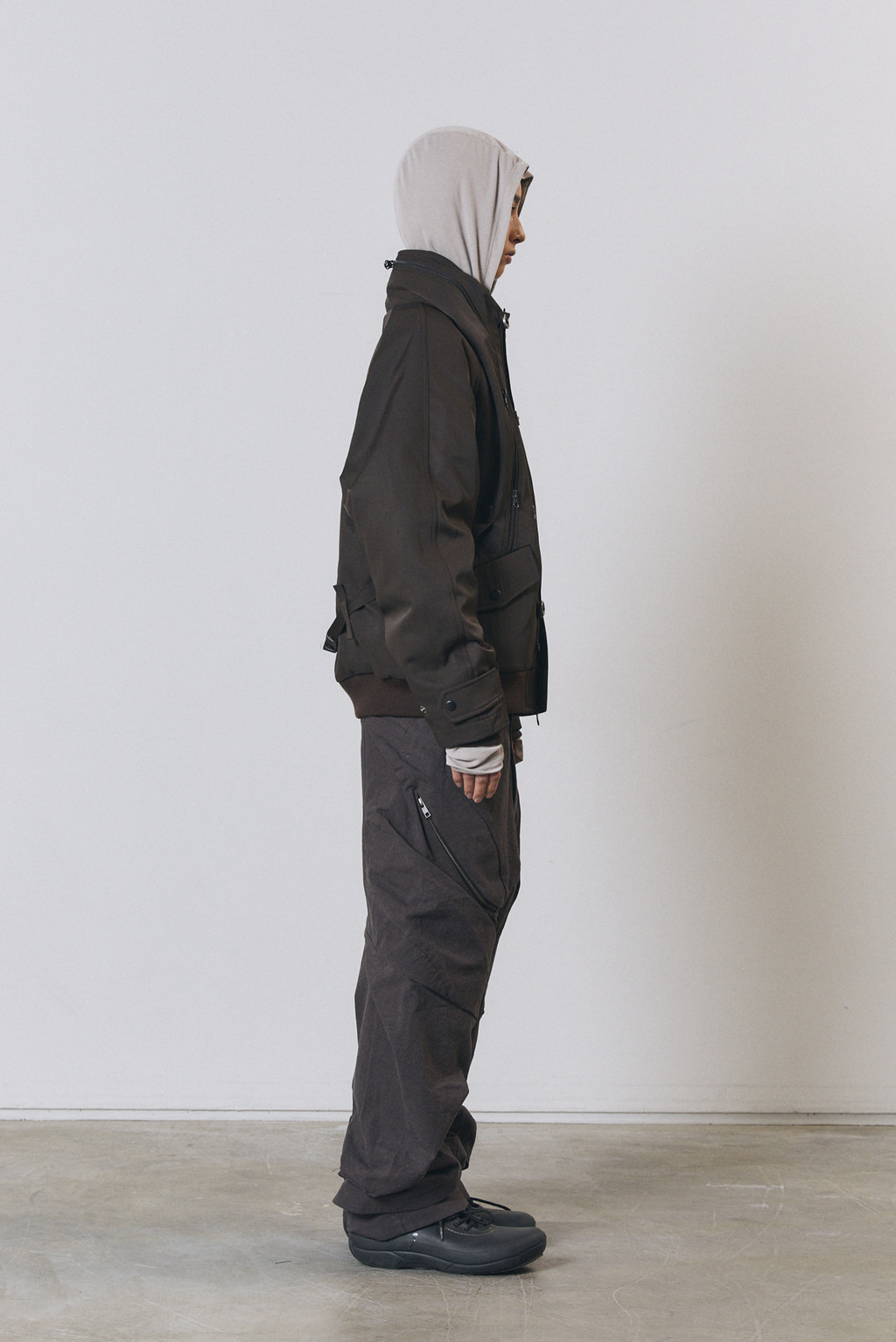 Hood storage inside the neckline with drawstring.