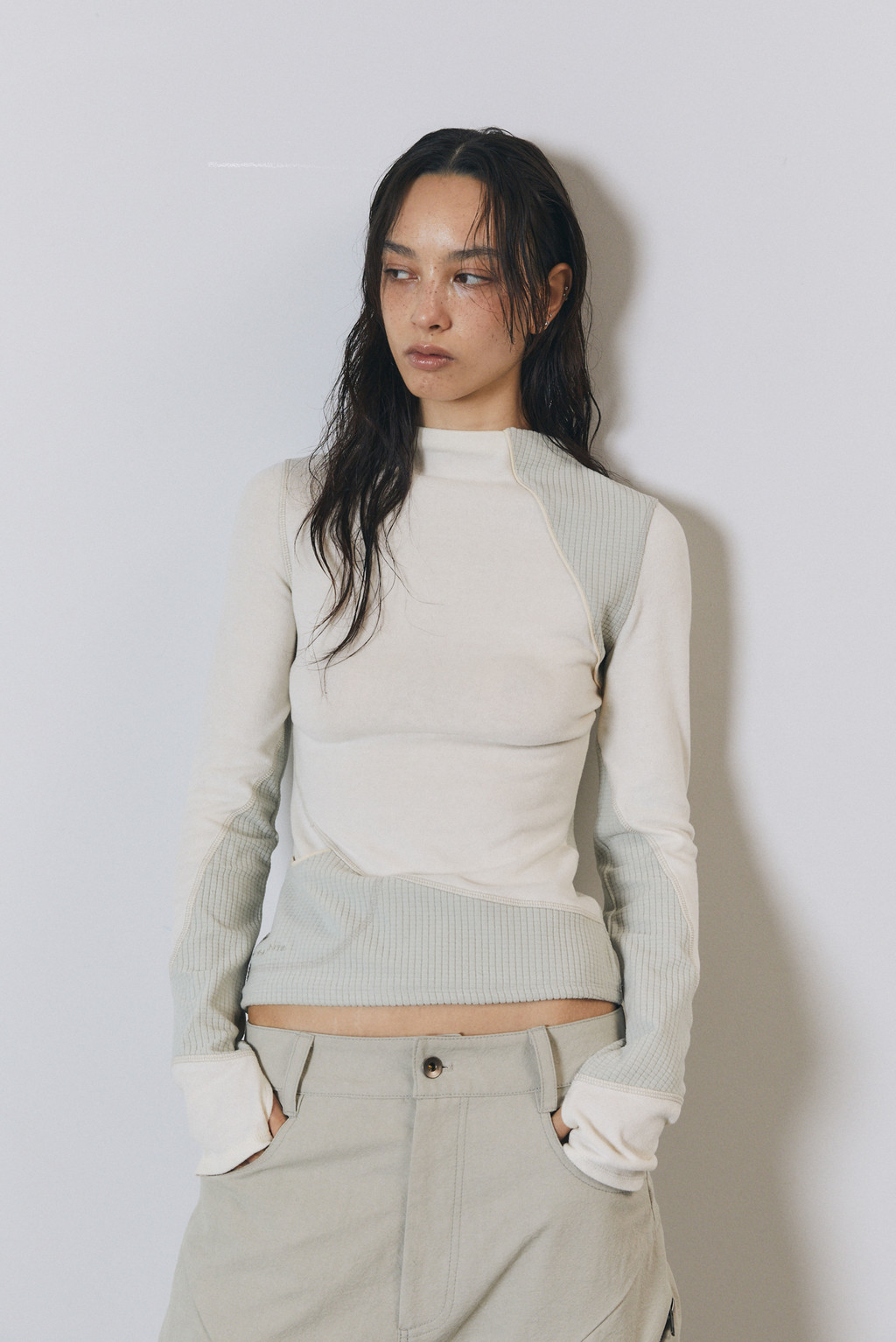 Women's stretchable high neck long sleeve top.