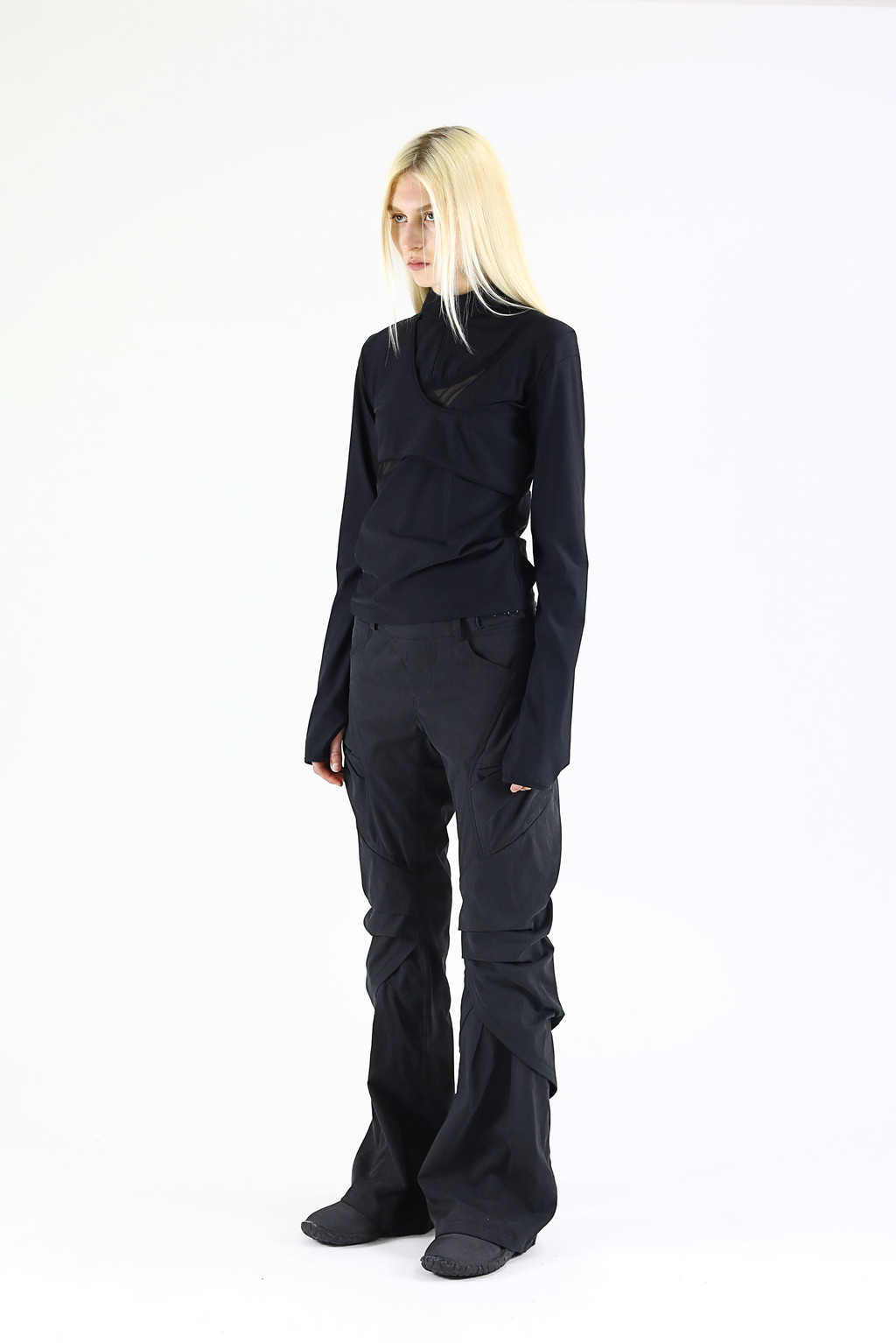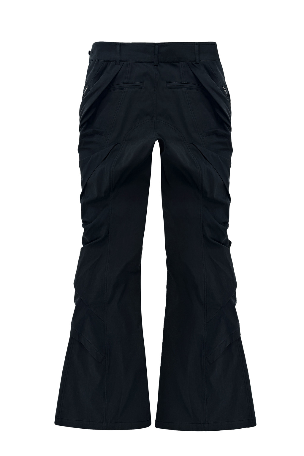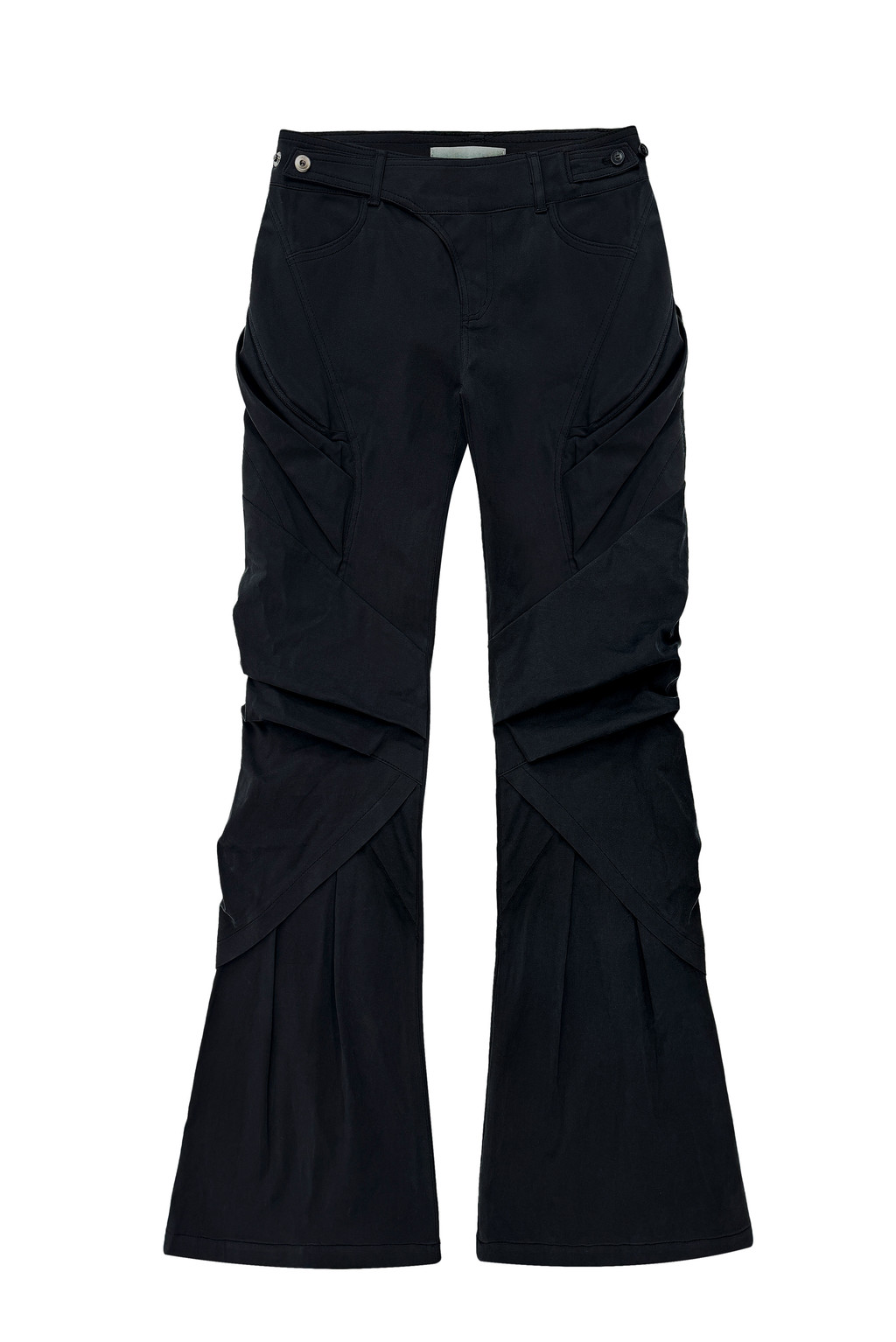 Draped silhouette bootcut pants.